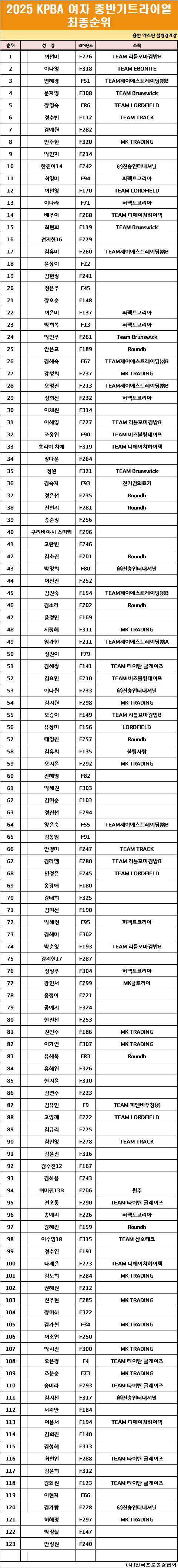 2025 KPBA 여자 중반기 트라이얼 최종성적