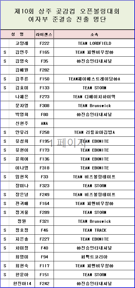 [명단] 제10회 상주 곶감컵 오픈볼링대회 여자부 준결승 진출 명단 페이지 정보 작성자 한국프로볼링 작성일 25-11-11 21:56 조회 2,524회 댓글 0건 본문 제10회 상주 곶감컵 오픈볼링대회 여자부 준결승 진출 명단 추천0 이전글[대회 공지] 2025 로드필드 . 한스컵 프로볼링대회[수정 : 11.13] 다음글[대진표] 2025 브런스윅컵 프로볼링대회 TV파이널 대진표 목록 댓글목록 0 댓글목록 등록된 댓글이 없습니다.