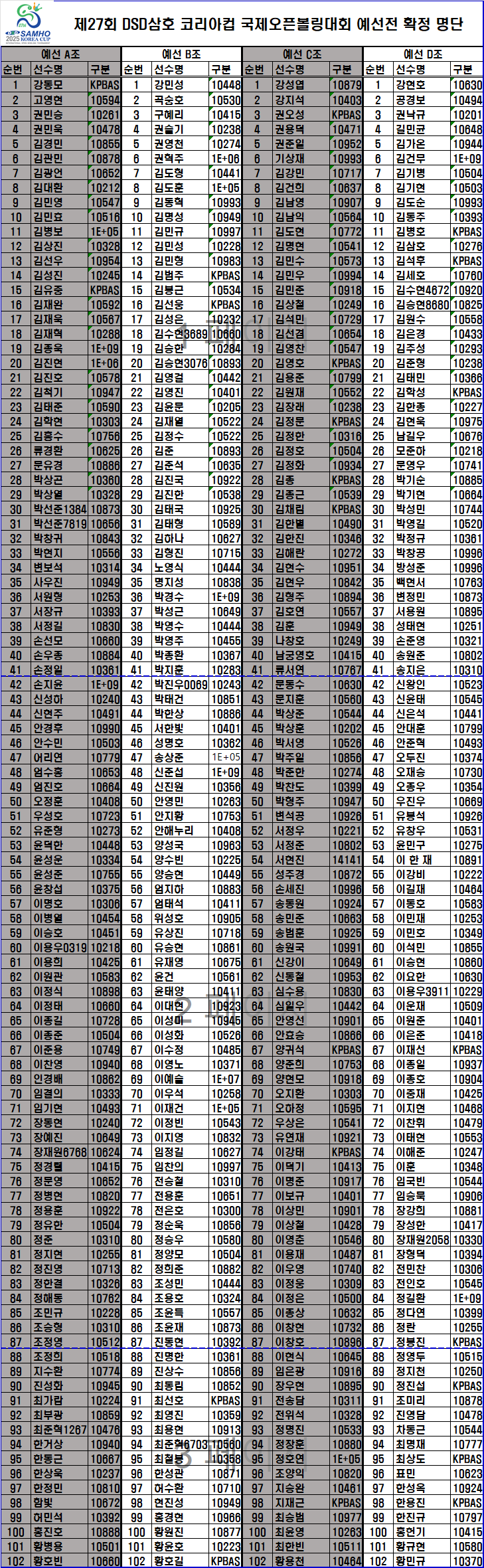 [명단 공지] 제27회 DSD삼호 코리아컵 국제오픈볼링대회 예선전 명단 공지 페이지 정보 작성자 한국프로볼링 작성일 25-09-12 13:26 조회 3,720회 댓글 0건 본문 . 추천0 이전글[조배정] 제27회 DSD삼호 코리아컵 국제오픈볼링대회 조배정 다음글[대진표] 제2회 리틀꼬마김밥컵 여자프로볼링대회 파이널 대진표 목록 댓글목록 0 댓글목록 등록된 댓글이 없습니다.