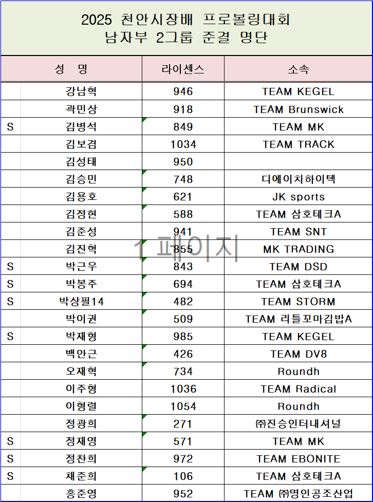 2025 천안시장배 프로볼링대회 남자부 2그룹 준결승 진출 명단 페이지 정보 작성자 한국프로볼링 작성일 25-06-02 22:52 조회 2,234회 댓글 0건 본문 2그룹 진출명단 추천0 이전글[TV파이널 대진표 공지] 2025 천안시장배 프로볼링대회 TV파이널 대진표 다음글2025 천안시장배 프로볼링대회 여자부 준결승 진출 명단 목록 댓글목록 0 댓글목록 등록된 댓글이 없습니다.