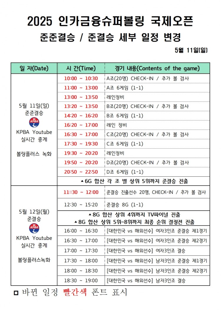 [일정변경 공지] 2025 인카금융슈퍼볼링 국제오픈 준준결승 / 준결승 세부일정 변경 페이지 정보 작성자 한국프로볼링 작성일 25-05-10 08:40 조회 4,180회 댓글 0건 본문 . 추천0 이전글[명단] 2025 인카금융슈퍼볼링 국제오픈 준준결승 진출명단 다음글[조배정] 2025 인카금융슈퍼볼링 국제오픈 본선 조배정 원본 및 레인배정(예선 순위 업데이트) 목록 댓글목록 0 댓글목록 등록된 댓글이 없습니다.