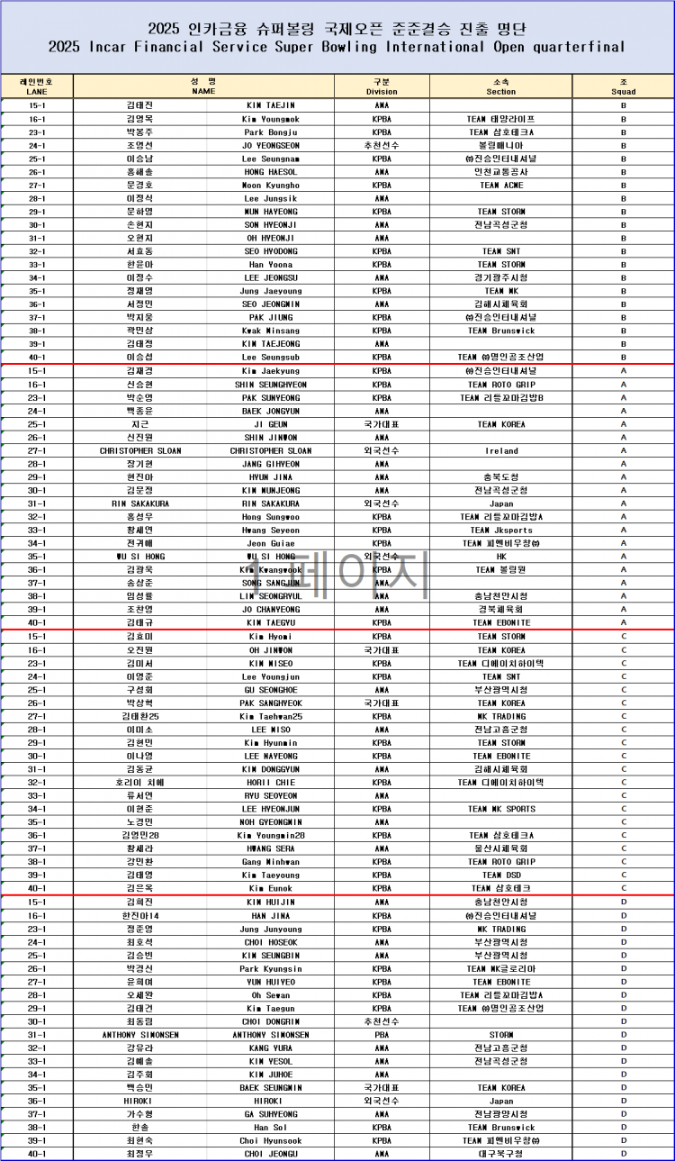 [명단] 2025 인카금융슈퍼볼링 국제오픈 준준결승 진출명단 페이지 정보 작성자 한국프로볼링 작성일 25-05-11 00:30 조회 3,627회 댓글 0건 본문 2025 인카금융슈퍼볼링 국제오픈 준준결승 진출명단 추천0 이전글[조배정&레인배정] 2025 원주컵 국제오픈 초청볼링대회 조배정 및 레인배정(수정 : 볼링파크 레인배정 변경) 다음글[일정변경 공지] 2025 인카금융슈퍼볼링 국제오픈 준준결승 / 준결승 세부일정 변경 목록 댓글목록 0 댓글목록 등록된 댓글이 없습니다.
